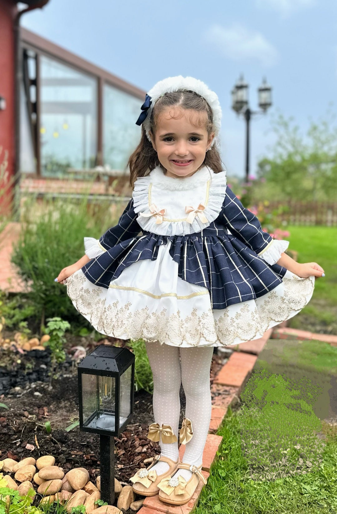SONATA PREORDER (4-6wk turnaround) - Navy golden lace fur puffball dress IN25-13